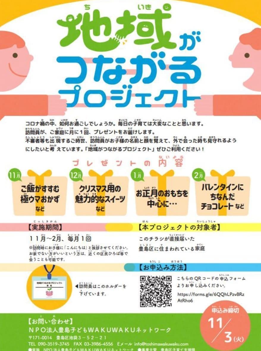 2020年度から豊島区とタイアップして、「地域がつながるプロジェクト」に取り組んでいます。地域の有償ボランティア訪問インがお菓子などのプレゼントをもって訪問し、子どもや家庭の状況を把握し、地域で子どもを見守る事業です。