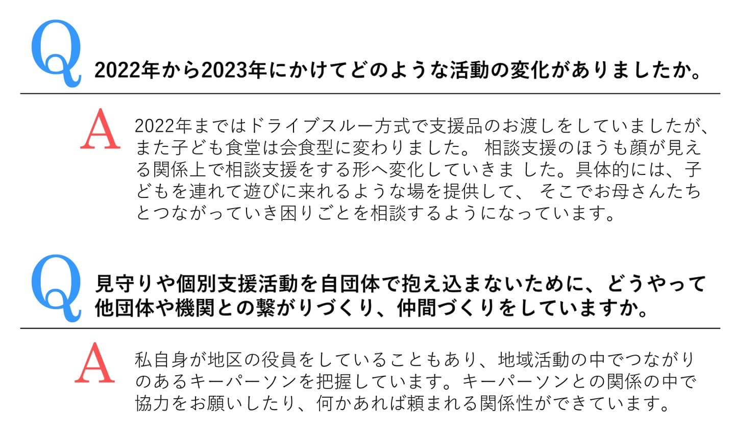 コロナ禍をきっかけに、フードパントリーの活動を開始しました。月に1回、特にひとり親家庭を対象とし220世帯ほどに配布をしています。支援情報はLINEで受け取ることができます。LINE登録時にひとり親世帯、子育て世帯、というような形でカテゴリー分けをします。情報発信の際はカテゴリー別で支援内容を発信します。フードパントリーは、時間を分けたドライブスルー方式。時間を分け配布することで、他人と重なるのを防ぎ、受け取り側も、他の人の目を気にすることなく、取りに行くことができます。渡す際には、その場で声掛けも行っています。申し込みはPeatixを活用し、必須入力の項目として、今の問題や困りごとなどの悩みも書くことができます。