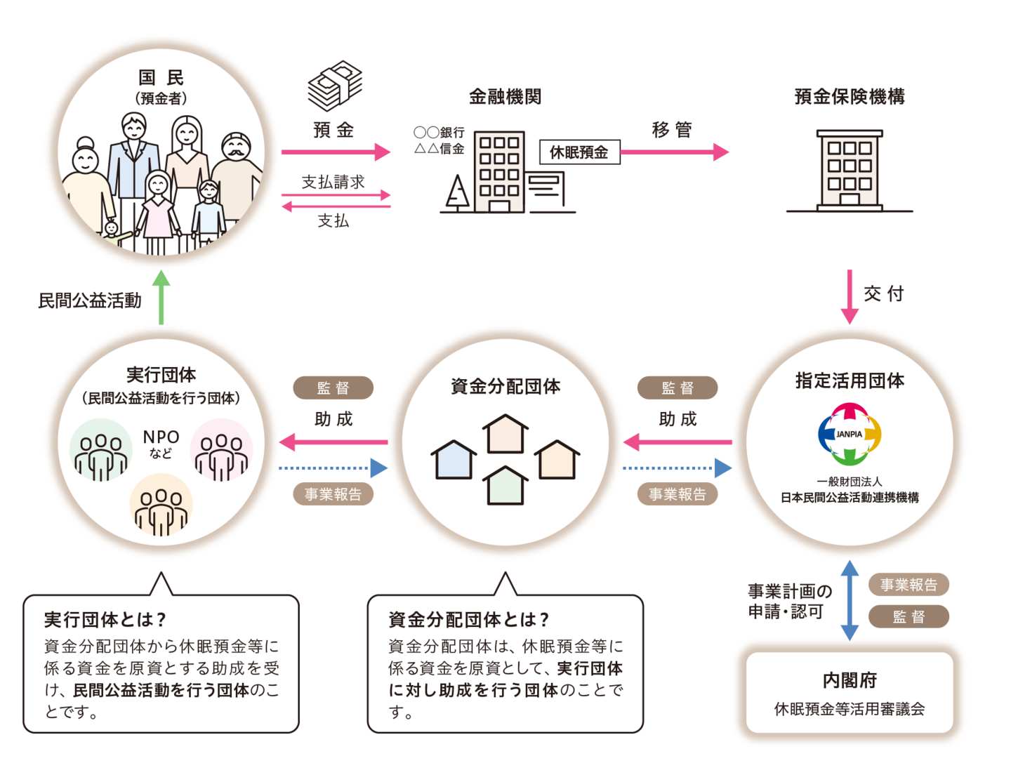 2009年1月1日以降の取引から10年以上、その後の取引のない預金等(休眠預金等)を社会課題の解決や民間公益活動の促進のために活用する制度が2019年度から始まりました。この制度は資金の特性上、公益性が高いことから「指定活用団体」「資金分配団体」「実行団体」と3つの役割にわけられて運用されています。(下図参照)