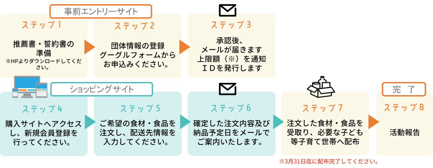 ひとり親家庭等の子どもの食事等支援を行う活動団体支援として食品・食材を寄贈します。ご希望される方は、食品提供申し込み案内文をよくお読みの上、推薦書・誓約をダウンロードし、事前エントリーサイト(左のボタンをクリック下さい)より申請してください。