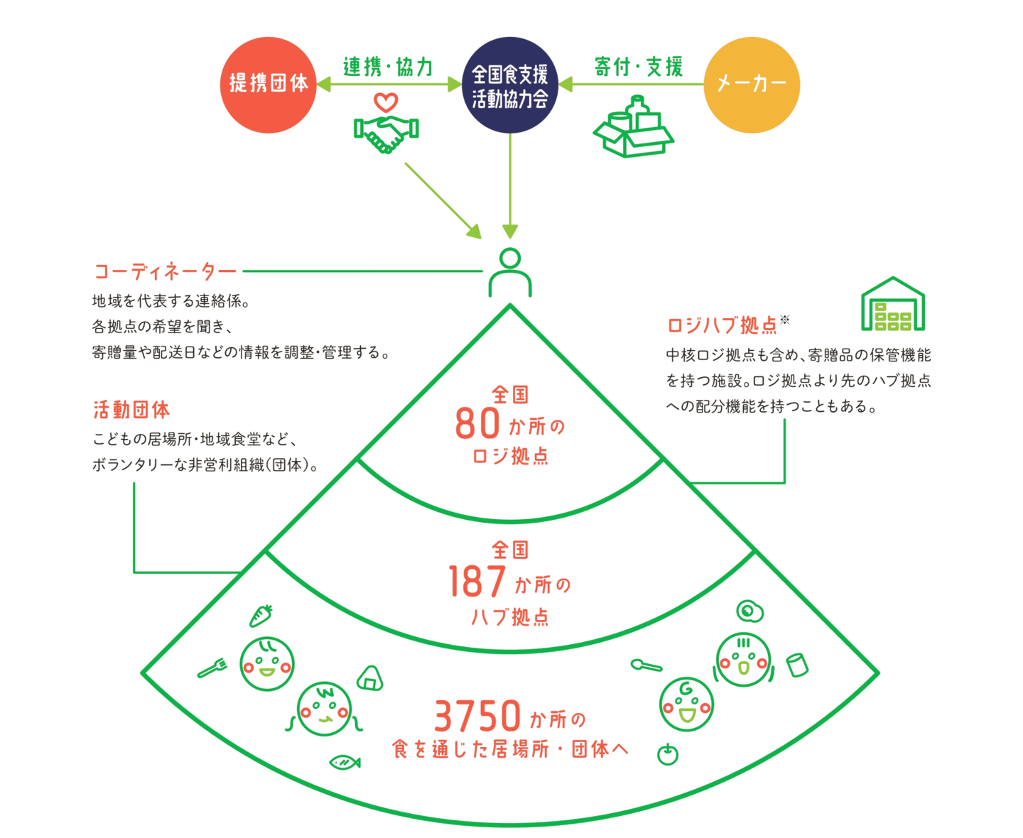 全国のこども食堂等の「居場所」に集う子どもから高齢者等すべての人が食事を得られる環境をサポートするシステムです。食支援を行う団体や自治体から、食品寄贈が受けやすいよう、冷凍・冷蔵設備を含む保管スペースをもつ拠点を全国に整備し、流通をサポートするWEBシステムの開発、企業・行政への学習会を開催しています。