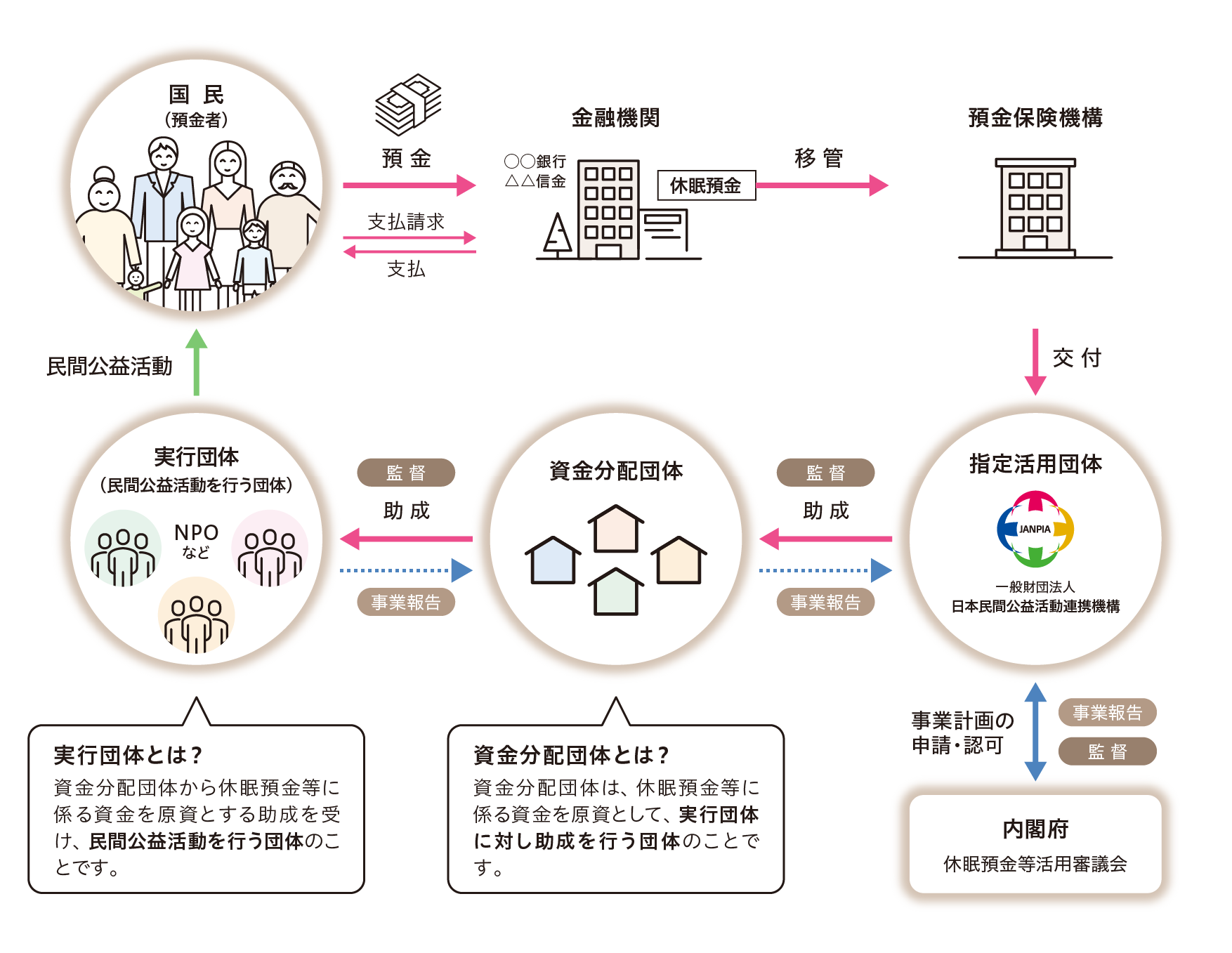 2009年1月1日以降の取引から10年以上、その後の取引のない預金等(休眠預金等)を社会課題の解決や民間公益活動の促進のために活用する制度が2019年度から始まりました。この制度は資金の特性上、公益性が高いことから「指定活用団体」「資金分配団体」「実行団体」と3つの役割にわけられて運用されています。(下図参照)