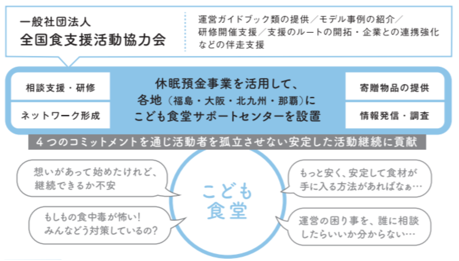 SDGsの浸透や子どもの貧困問題、フードロス問題などの顕在化により、行政・企業・NPOが連携して社会問題を解決していくことの重要性が高まってきました。この高まりから、全国食支援活動協力会では、休眠預金といった公共性の高い資金や、日本財団などの民間財団からの助成金をうけて、日本全国を対象とした食を通じた居場所の継続・発展に寄与する事業を展開しています。