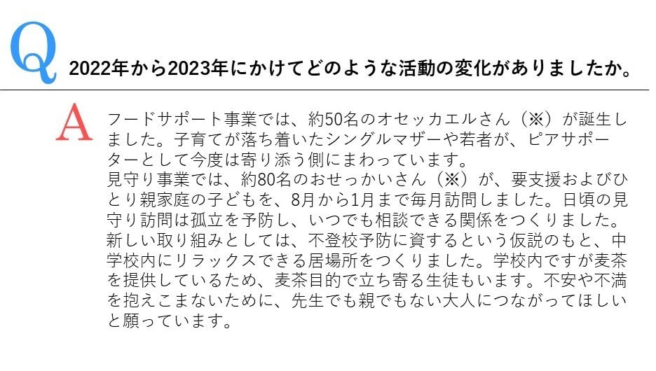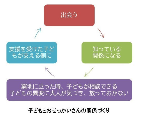 いということを伝え、市民の方たちがひとり親家庭の方から「お弁当があって本当に助かる」と言っている生の声を聞いて、「なんかできることがあったらやるったらわよ」という感じで変わっていきました。ひとり親さんももちろん変わっていきます。相談していいんだ、恥ずかしいことじゃないんだよ。こうやって私たちはみんなに支えらているんだよ、だから私たちも大きくなったら困っている人がいたら、支える人になろうねっていう感じで、変わっていくなと感じる。