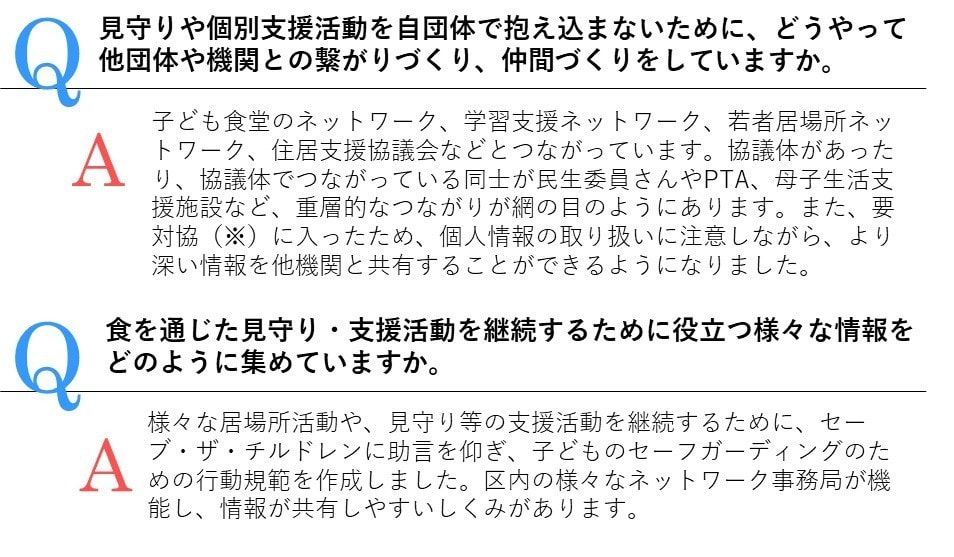 「このプロジェクトって乳幼児、小学生のうちに訪問するんですよ。乳幼児の時点でつながることで居場所や、地域の人々とのつながりを子どもが小さな時から作って、みんなで育てるための支援をその子どもの社会資源を作れる。地域でつないで、学習支援につながられたり、プレーパークにつないだり、ホームで泊まったりできる」(栗林さん)。今年度見守りを行っている200世帯のうち、100世帯が子ども相談支援センターの要保護児童。「訪問員さんはただ訪問して、プレゼントを渡して、「元気?」っていう。それだけでいいんです。いろんな形で相談事や困りごとをキャッチする体制を作っています。」