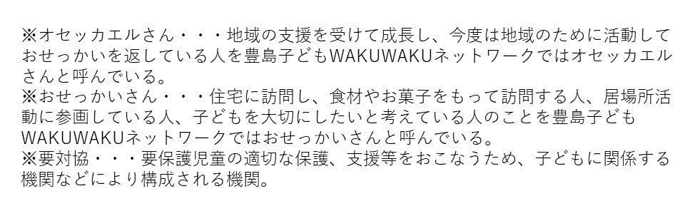 2020年度から豊島区とタイアップして、「地域がつながるプロジェクト」に取り組んでいます。地域の有償ボランティア訪問インがお菓子などのプレゼントをもって訪問し、子どもや家庭の状況を把握し、地域で子どもを見守る事業です。