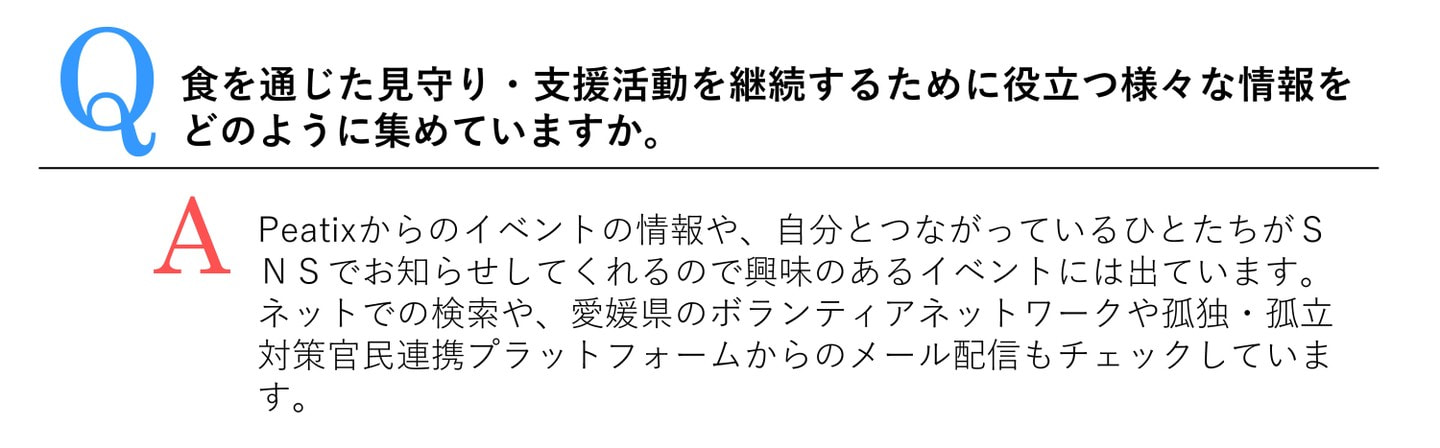 現在は、要体協に子ども食堂連絡協議会の会長が入っていたり、2か月に1回開催される「宇和島市子ども食堂連絡協議会」の共有会議では、市社協も入っていたりなど、行政との対話する機会もあります。「つながり力が必要だと思います。個人情報の問題もあり、情報の連携ができない所もあるが、今後は行政とうまく連携できる仕組みをもっと進めていきたいと思っています。」(松島さん)食支援から困窮者の支援へと活動が広がっているからこそ、行政や教育機関と重層的な連携を行うことで、支援の輪を広げ、受益者を取りこぼさない取り組みが行われています。