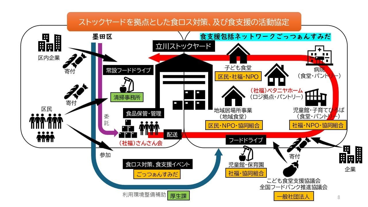 食品ロス対策のため墨田区議会の特別委員会に伊丹さんが呼ばれ、そこで倉庫を貸してほしい、定期便と一緒に食品も回してほしいと提案。議会と行政が協力的だったこともあり、そこから具体的な検討を始めて生まれたのが、ストックヤードを拠点とした食ロス対策、及び食支援の活動「食支援包括ネットワークごっつぁんすみだ」です。食品の一括管理、収集、仕分け、保管、配送を役割分担して行うスキーム作りに成功しました。食品の仕分けや管理、配送に関しては、障がい者の方が行ってくれています。ストックヤードには冷蔵庫、冷凍庫が完備されており、企業はこのストックヤードに一括寄付するだけで、多くのこども食堂等に食品が行き渡ります。
