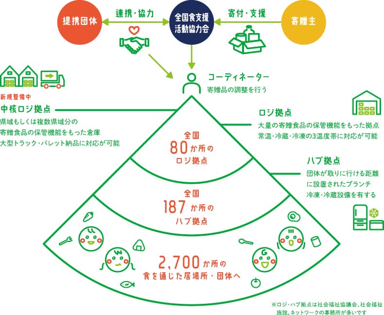 全国のこども食堂等の「居場所」に集う子どもから高齢者等すべての人が食事を得られる環境をサポートするシステムです。食支援を行う団体や自治体から、食品寄贈が受けやすいよう、冷凍・冷蔵設備を含む保管スペースをもつ拠点を全国に整備し、流通をサポートするWEBシステムの開発、企業・行政への学習会を開催しています。